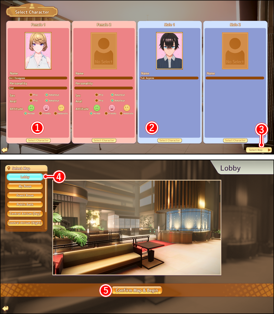 - Spinning the mouse wheel while over certain menu options or icons (Sex Position Icon, Map Selection, etc.) allows you to adjust them.