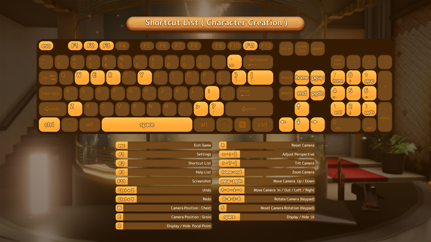 Press the F2 key to open the shortcut menu. *Note that screenshots are saved to the UserData->cap folder in your installation directory.■ Character Creation Keyboard Shortcuts